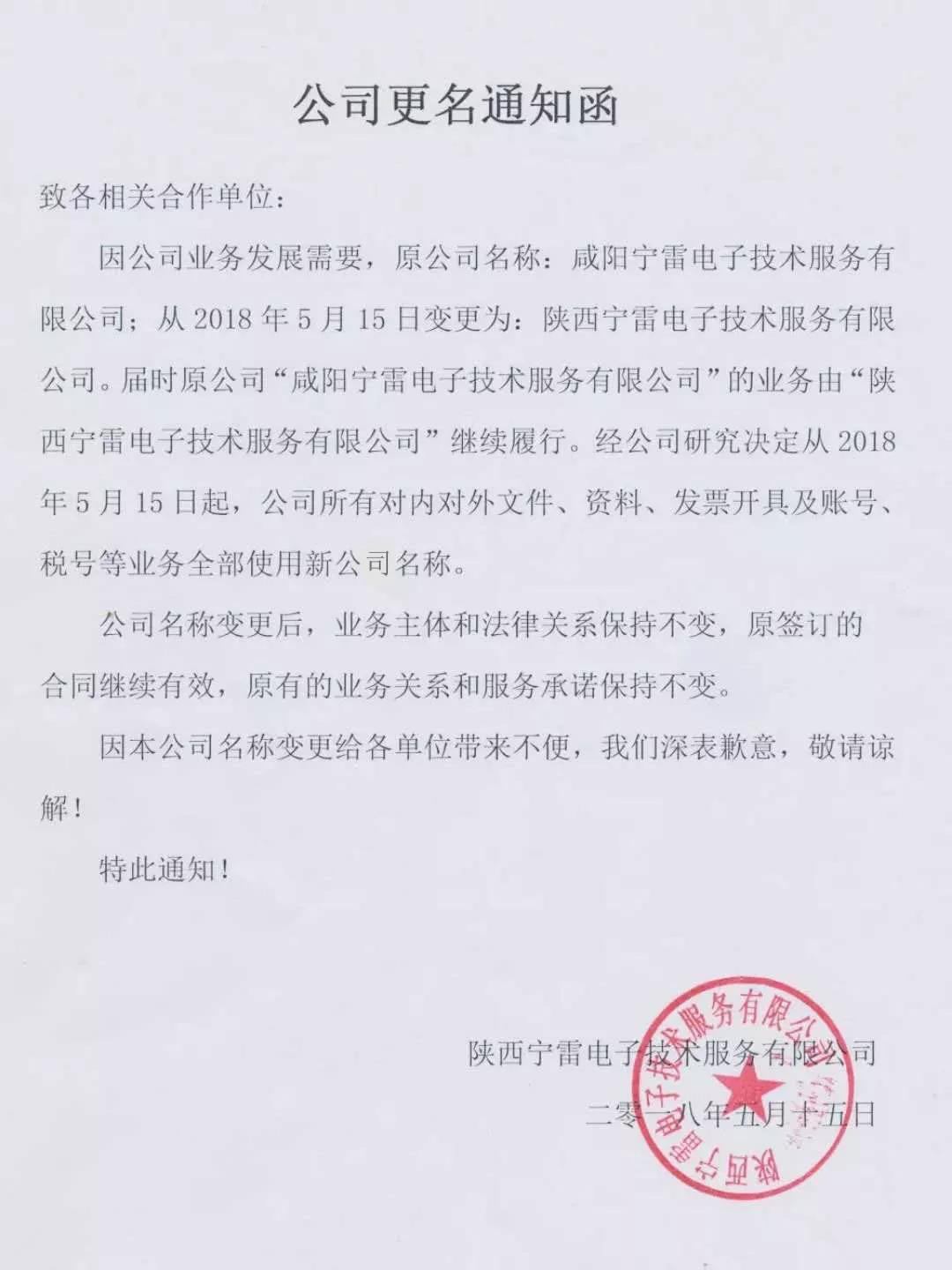 對(duì)的沒錯(cuò)!首先感謝各位的支持,正是有了各位的相助,我司的業(yè)務(wù)量得以穩(wěn)步提升。咸陽寧雷電子技術(shù)服務(wù)有限公司自即日起正式更名為陜西寧雷電子技術(shù)服務(wù)有限公司,文件如下: